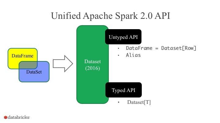 Note, starting in Spark 2.0, the DataFrame APIs will merge with Datasets APIs, unifying data processing capabilities across all libraries. Because of unification, developers now have fewer concepts to learn or remember, and work with a single high-level and type-safe API called Dataset. Conceptually, the Spark DataFrame is an alias for a collection of generic objects Dataset[Row], where a Row is a generic untyped JVM object. Dataset, by contrast, is a collection of strongly-typed JVM objects, dictated by a case class you define, in Scala or Java.